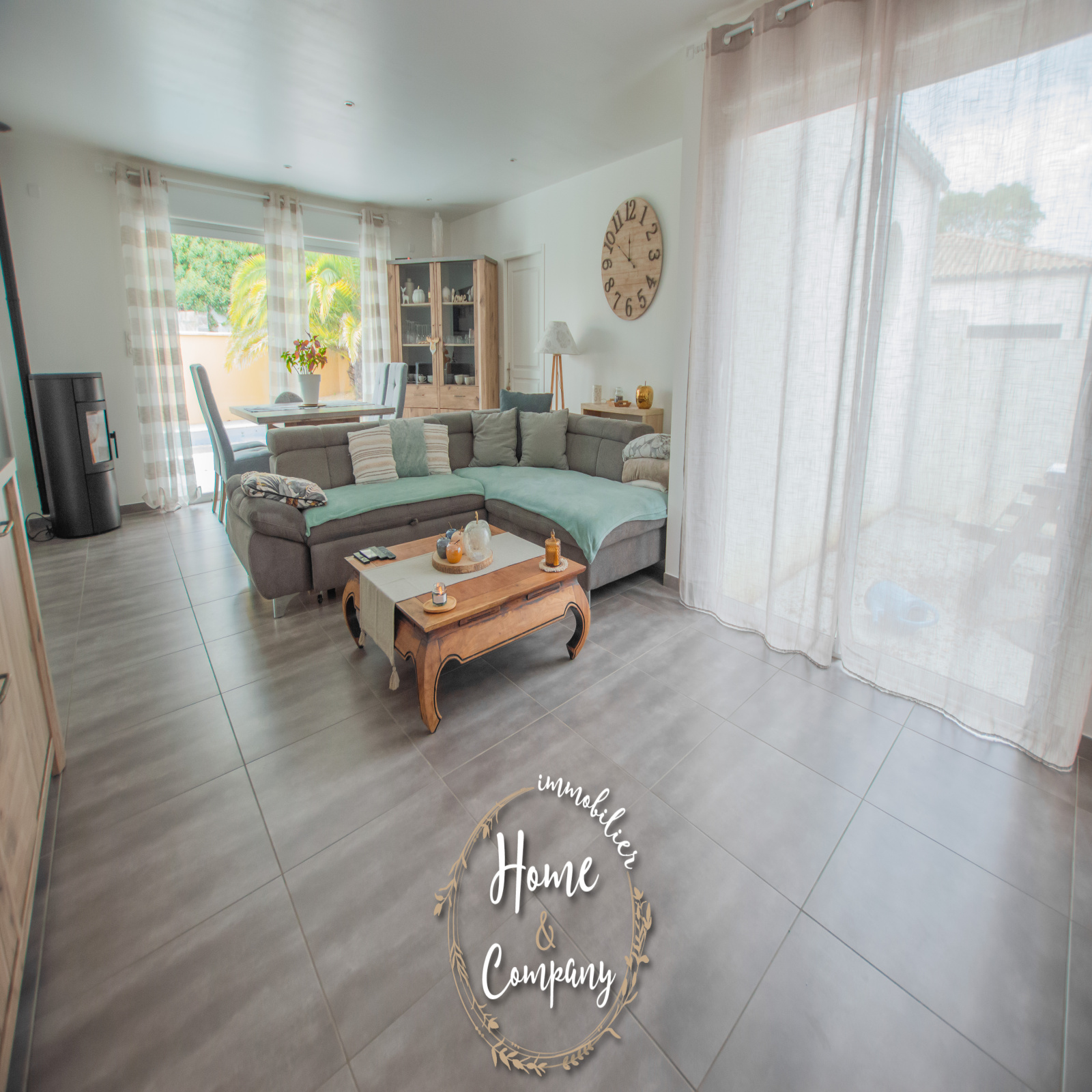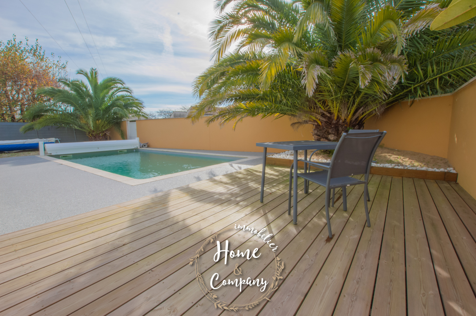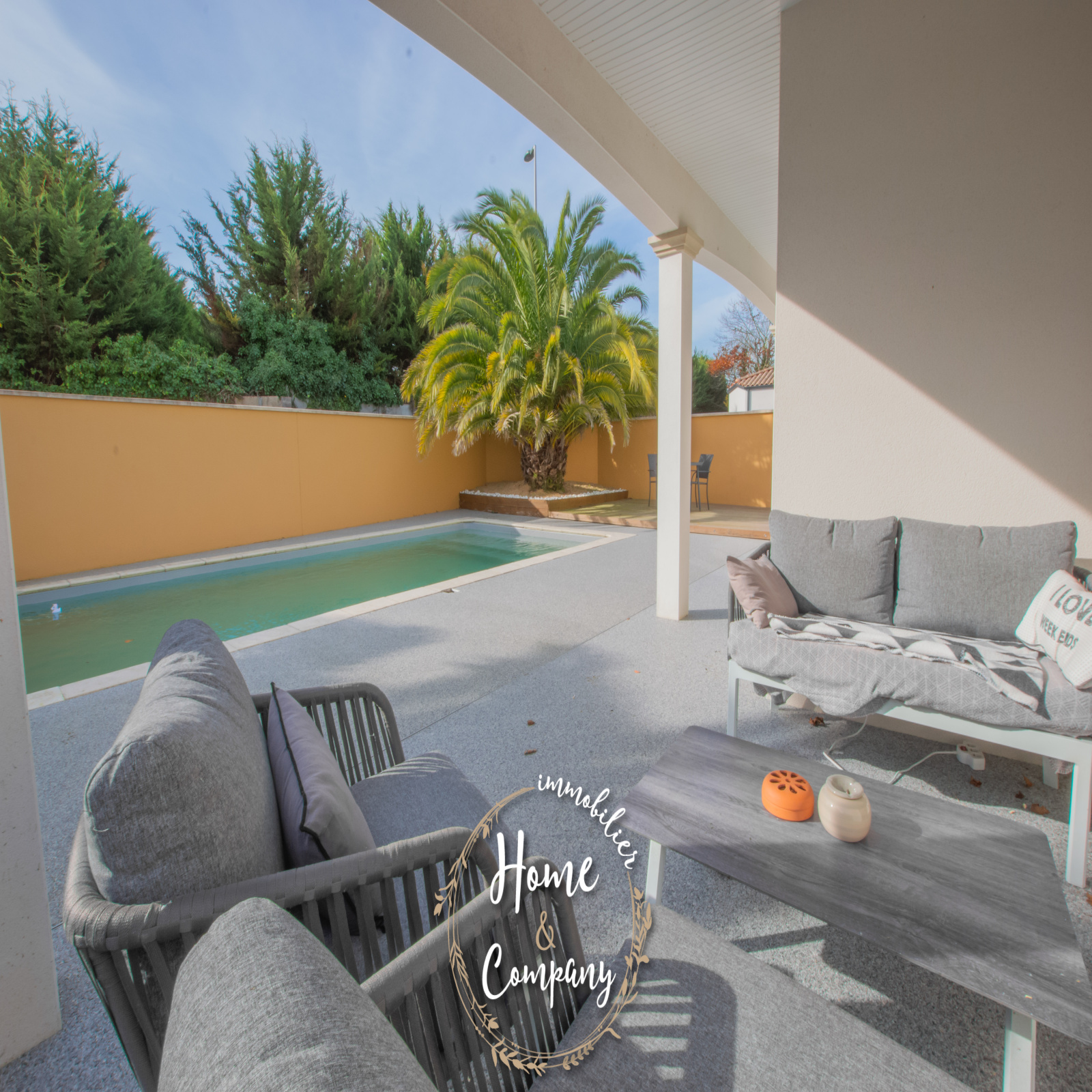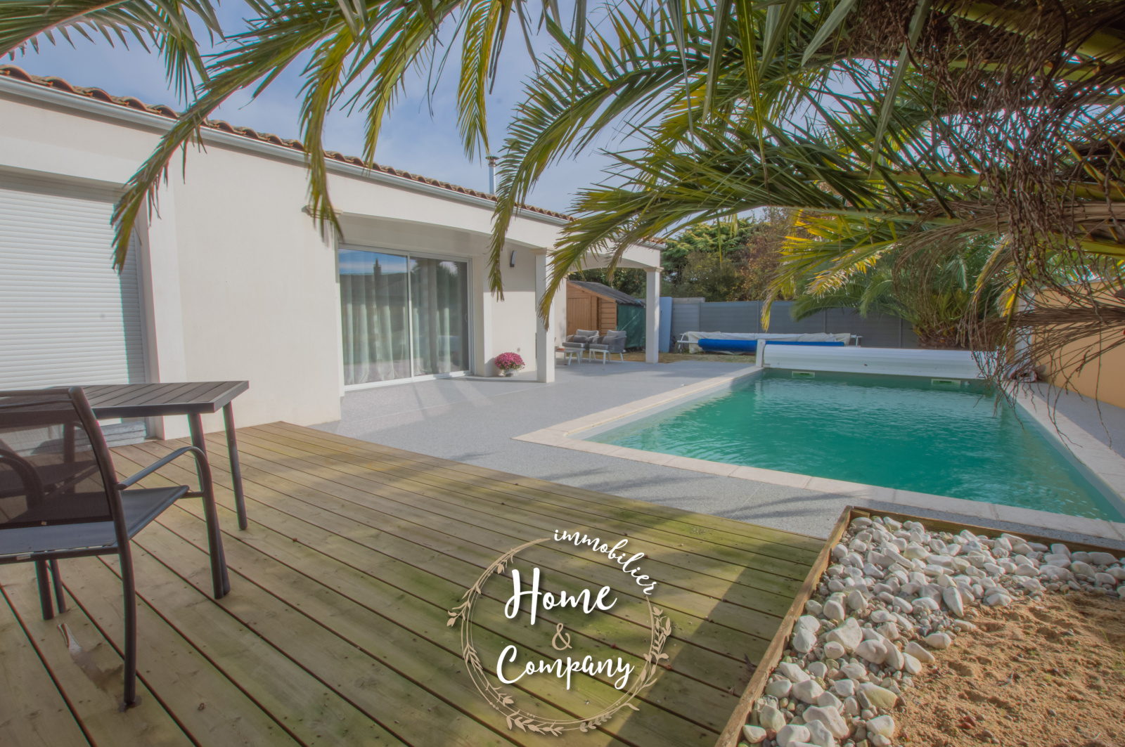 VAUX-SUR-MER - MAISON RÉCENTE DE PLAIN-PIED AVEC PISCINE - Située à moins de 950m des commerces de Val Lumière et à moins de 3700m de la plage de Pontaillac, Home & Company Immobilier vous présente cette agréable maison de plain-pied offrant une superficie habitable de 123m2 sur une parcelle de 471m2. Judicieusement pensée et tournée vers ses différents pôles extérieurs, elle vous offrira un véritable confort de vie. Dès l'entrée passée, cette maison dévoile une belle pièce de vie exposée SUD de 49m2 avec sa cuisine ouverte aménagée et équipée, l'ensemble ouvrant sur une terrasse et un patio. Une première partie nuit est composée d'une suite parentale avec chambre, salle d'eau/wc et dressing ouvrant également sur la terrasse. En opposition, une deuxième partie nuit cette fois-ci composée de 2 chambres avec placards se partageant une salle de bains, un bureau et un WC indépendant. Un garage et un abri de jardin constituant les annexes de cette jolie maison lumineuse avec piscine. Du stationnement privatif est assuré pour cette maison environnante. Plus de photos et visite virtuelle sur le site de l'agence Home & Company immobilier. DONT honoraires 3,63% à la charge de l'acquéreur. Montant moyen des dépenses annuelles d'énergie pour un usage standard, établi à partir des prix de l'énergie de l'année 2021 : entre 1170€ et 1640€.