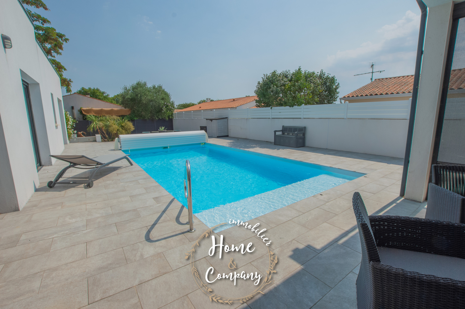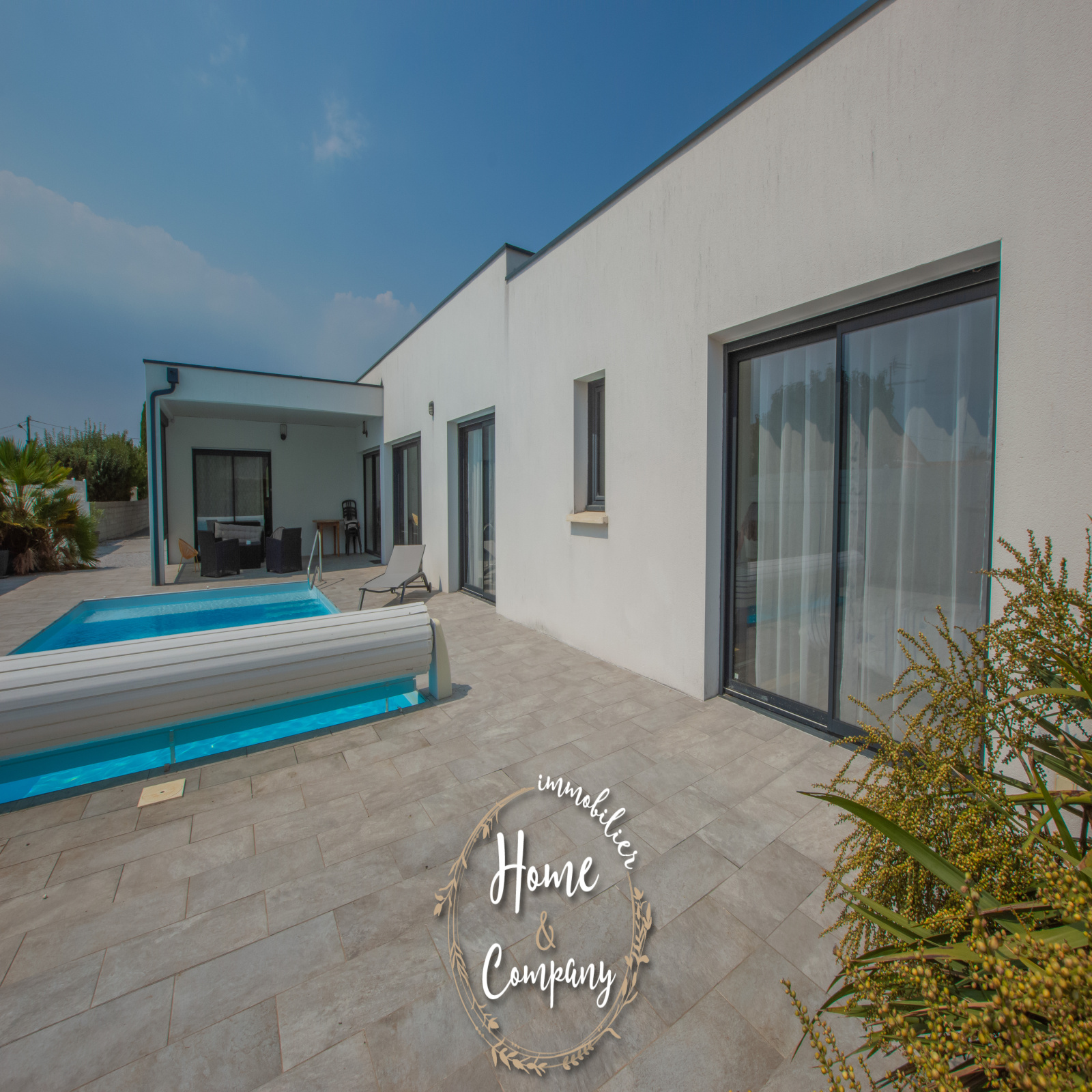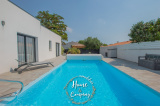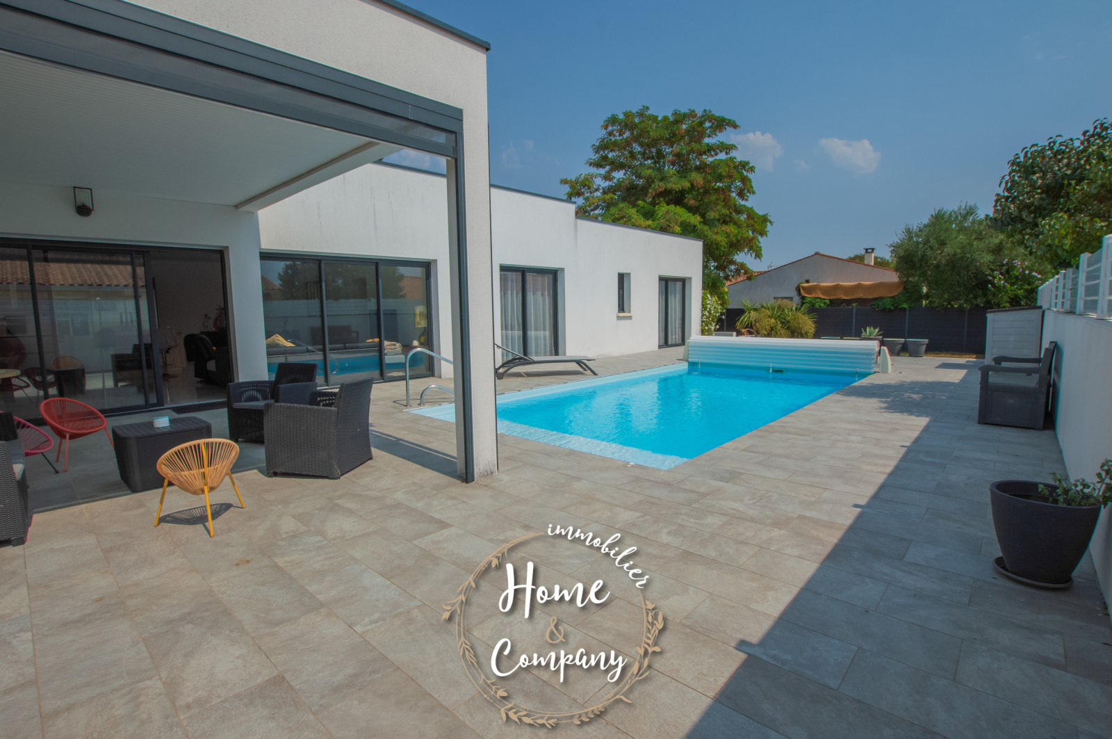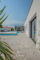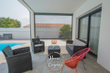 VAUX-SUR-MER - MAISON RÉCENTE CUBIQUE AVEC PISCINE - Située à moins de 2000m de la plage de Nauzan et à moins de 1000m des commerces de VAUX SUR MER, Home & Company Immobilier vous présente en EXCLUSIVITÉ cette agréable maison récente aux normes RT2012 de plain-pied offrant une superficie habitable de 145m2 sur une parcelle de 875m2. Judicieusement pensée et tournée vers ses différents pôles extérieurs, elle saura vous offrir un véritable confort de vie. Dès l'entrée passée, cette maison dévoile une belle pièce de vie de 57m2 baignée de lumière grâce à ses nombreuses ouvertures donnant sur une jolie terrasse dont une partie est couverte. La cuisine ouverte de bonne facture faisant partie intégrante de cette pièce de vie est aménagée et équipée ouvrant sur un patio. Côté nuit, une première partie est composée d’une belle suite parentale de 20m2 disposant d'une chambre, d'une salle d'eau avec WC et d’un dressing. WC indépendant au niveau de l’entrée. En opposition la deuxième partie nuit composée de 3 chambres avec placards dont deux ouvrant sur la terrasse, une salle de bains avec baignoire et douche ainsi qu’un WC. Le jardin est agrémenté d'une piscine (8x4m) chauffée par PAC. Un cellier et un garage de 24m2 constituent les annexes de cette jolie maison. De bonnes prestations sont assurées : accès motorisés, chauffage au sol par PAC... Du stationnement privatif est assuré pour cette maison aboutie. Visite virtuelle sur le site de l'agence Home & Company immobilier. DONT honoraires 3,89% à la charge de l'acquéreur. Montant moyen estimé des dépenses annuelles d'énergie pour un usage standard, établi à partir des prix de l'énergie de l'année 2021, 2022 et 2023 : entre 580€ et 820€.