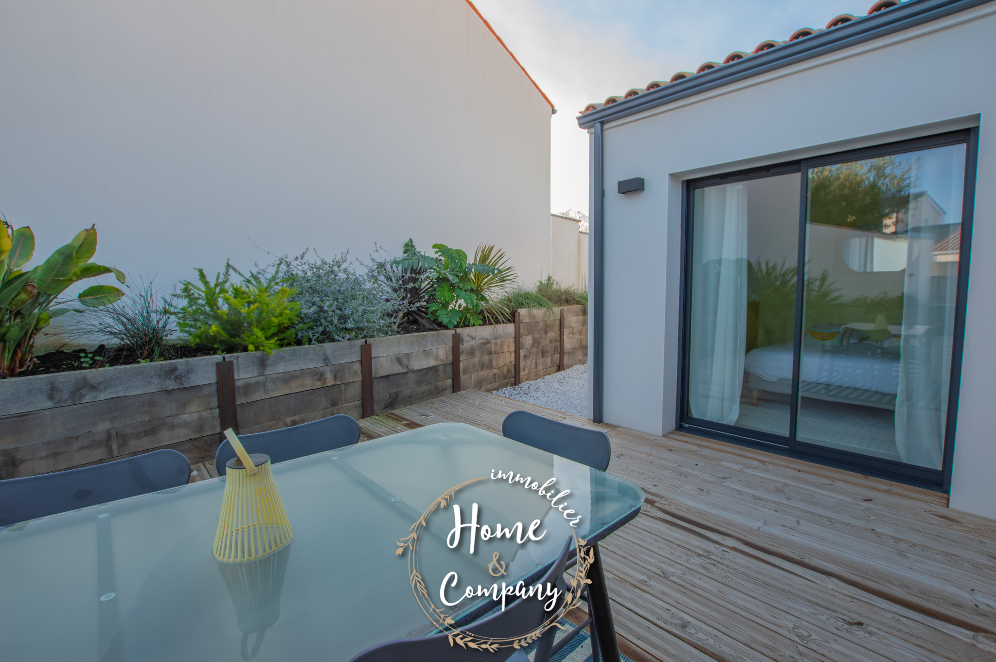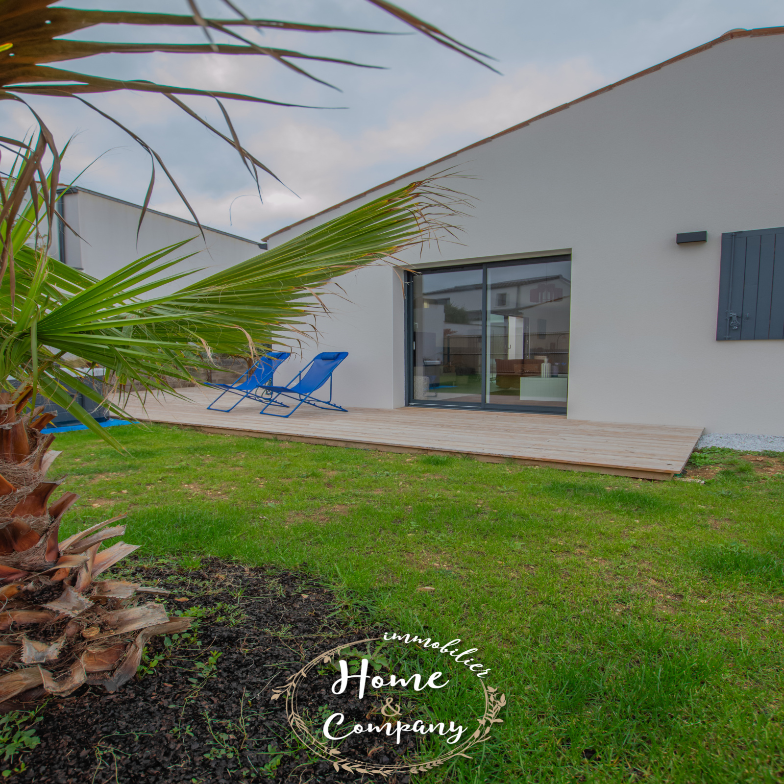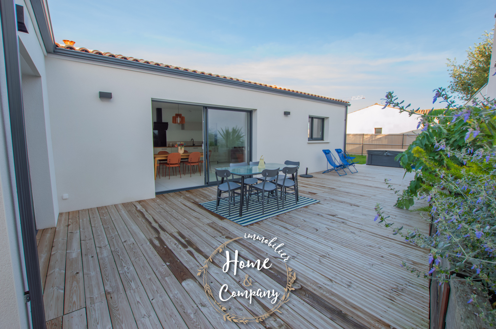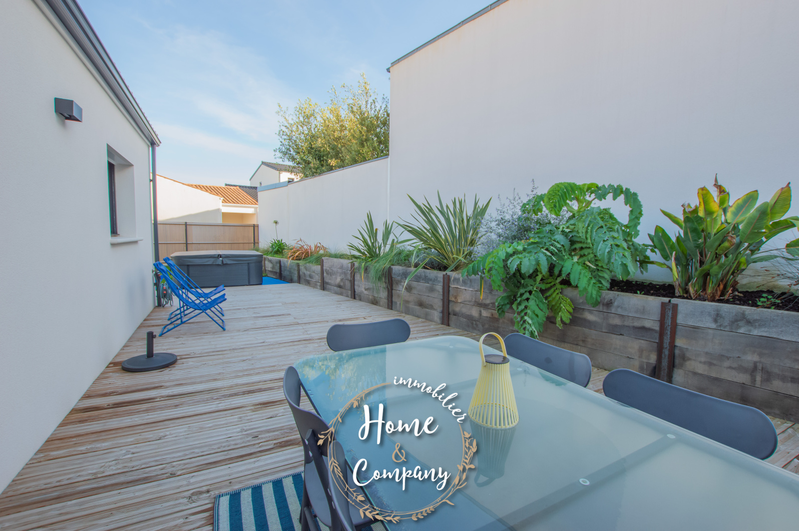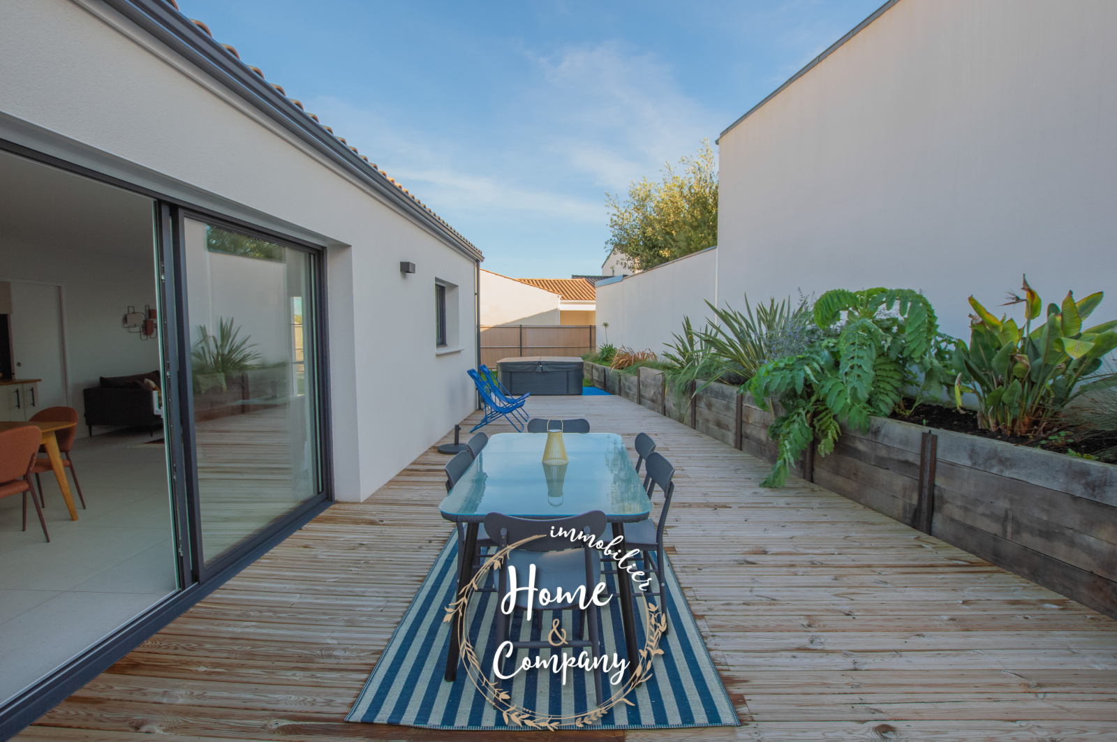 VAUX-SUR-MER - MAISON LUMINEUSE DE PLAIN-PIED - Située proche du centre-ville de VAUX-SUR-MER, Home & Company Immobilier vous présente cette maison de 2024 sous garanties offrant une superficie habitable de 99m2 sur une parcelle de 468m2. Baignée de lumière, elle dévoile une fois l'entrée passée une très belle pièce de vie de 52m2 intégrant une cuisine aménagée et équipée. Ce séjour ouvre par différents accès sur une terrasse en bois exposée SE et SO ainsi que sur le jardin aménagé. Côté nuit, une première partie offre une chambre et une salle d'eau. Puis en opposition, un dégagement vient desservir 2 autres chambres dont une avec placard, une salle d'eau et un WC indépendant. Le jardin bénéficie d'un SPA pour se détendre et une piscine pourrait trouver sa place. Garage et stationnement privatif. DONT honoraires 4% à la charge de l'acquéreur (délégation de mandat). Montant moyen des dépenses annuelles d'énergie pour un usage standard, établi à partir des prix de l'année 2021, 2022, 2023 : entre 420€ et 610€.