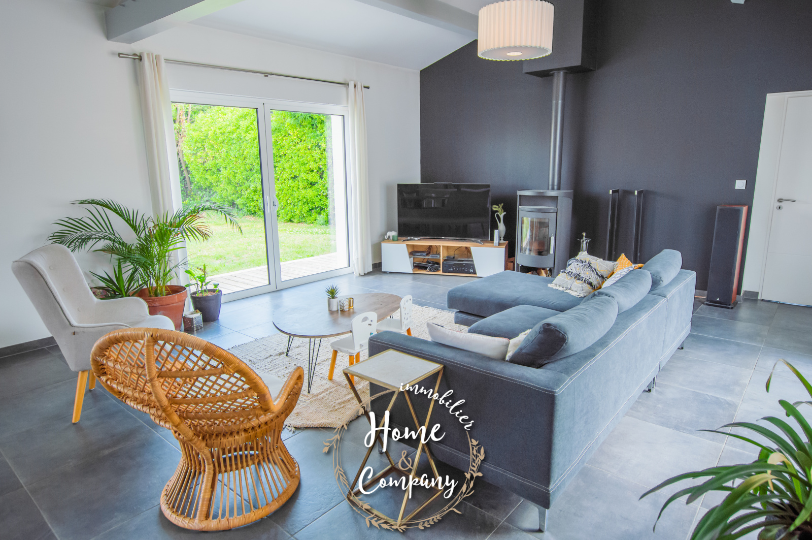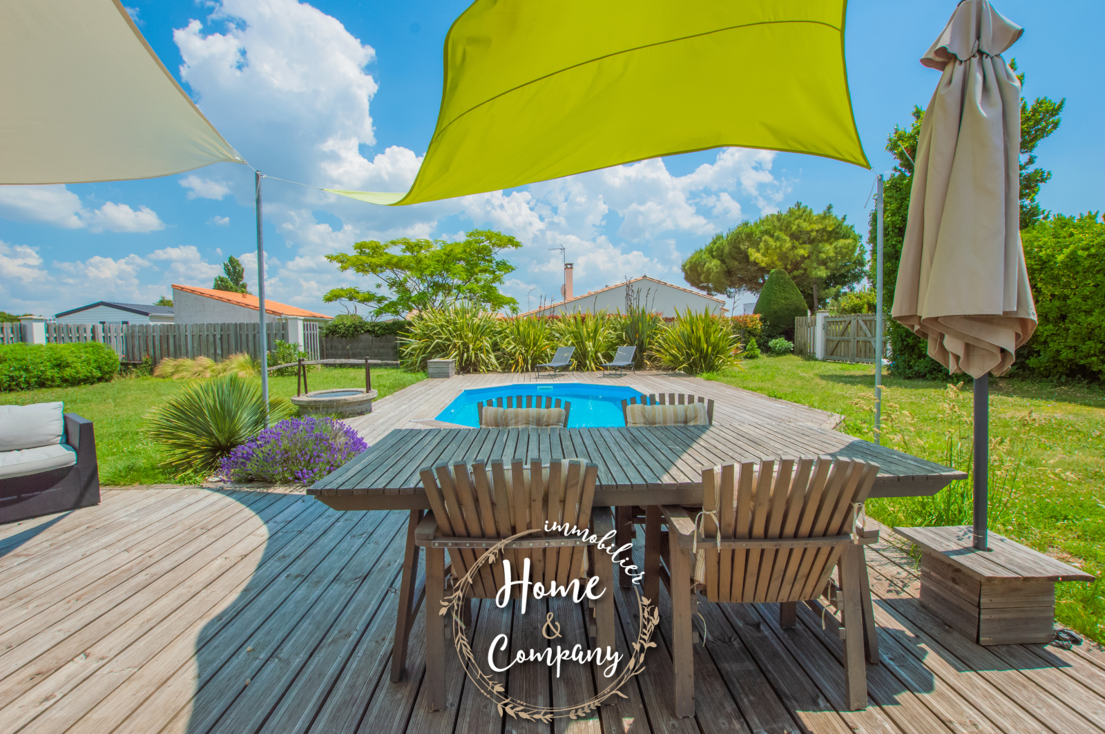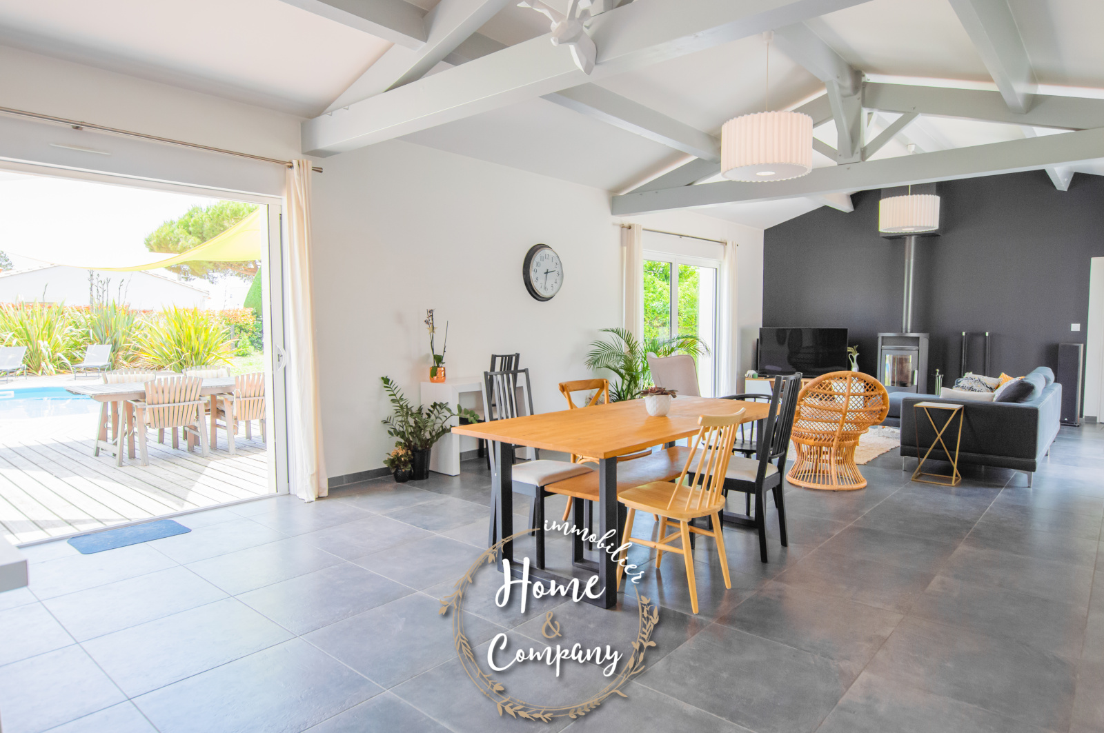 MEDIS - MAISON DE PLAIN-PIED ESPRIT RETAISE - Située proche des commerces du centre bourg de MEDIS, Home & Company Immobilier vous présente en EXCLUSIVITE cette jolie maison aux notes Rétaises développant de plain-pied 173m2 habitables sur une parcelle de 1075m2. L'entrée avec placard faisant office de vestiaire, dévoile par une porte esprit loft, un spacieux séjour de 69m2 avec une belle hauteur sous plafond laissant apparaître des poutres. Ce séjour tourné vers ses extérieurs donne accès par des baies à galandage, à votre convenance, sur un patio intime ou sur une terrasse avec en continuité le jardin et la piscine chauffée. Une cuisine ouverte de type dinatoire complète la pièce de vie. Côté nuit, une chambre parentale avec sa salle de bains/douche est complétée par une seconde partie nuit composée de 3 autres chambres, une salle d'eau et un WC indépendant. Un second WC se trouve dans l'entrée. Une lingerie et un garage de 32m2 constituent les annexes de cette maison où règne une atmosphère très plaisante avec en plus de beaux volumes, des espaces conviviaux pour recevoir. Stationnement privatif sur la parcelle. DONT honoraires 3,90% à la charge de l'acquéreur. Plus de photos et visite virtuelle sur le site de l'agence Home & Company Immobilier.