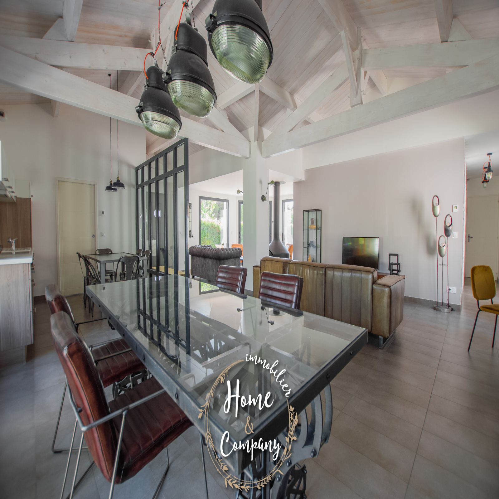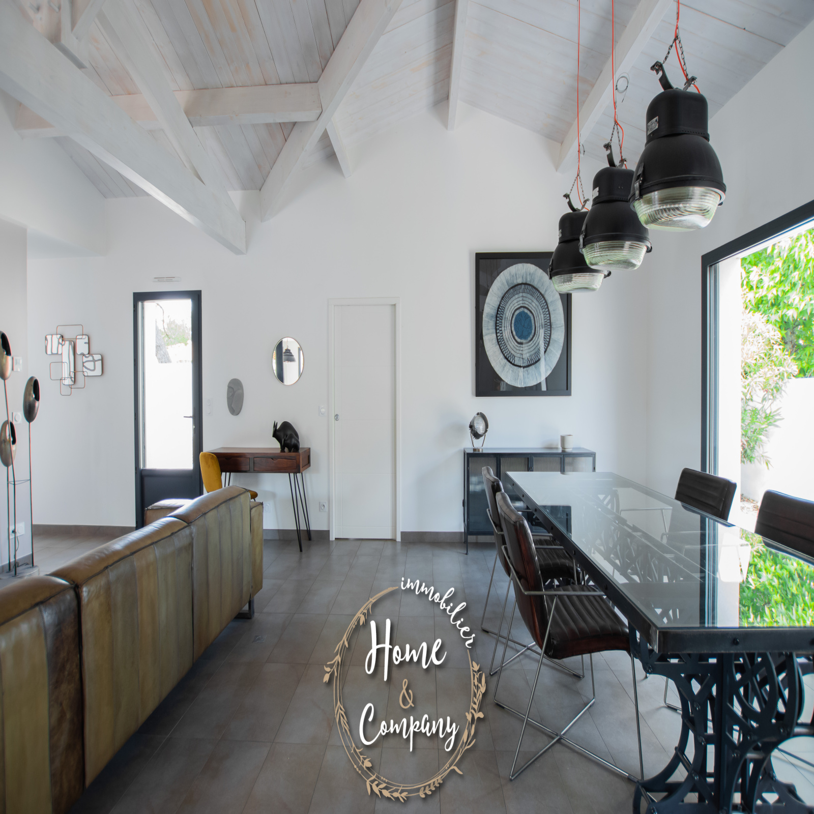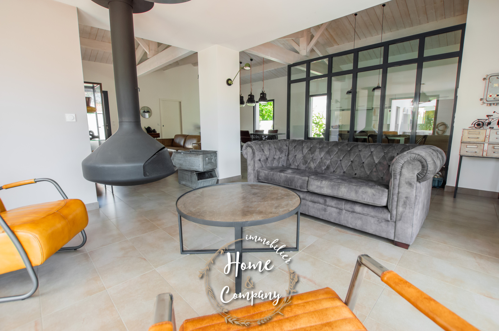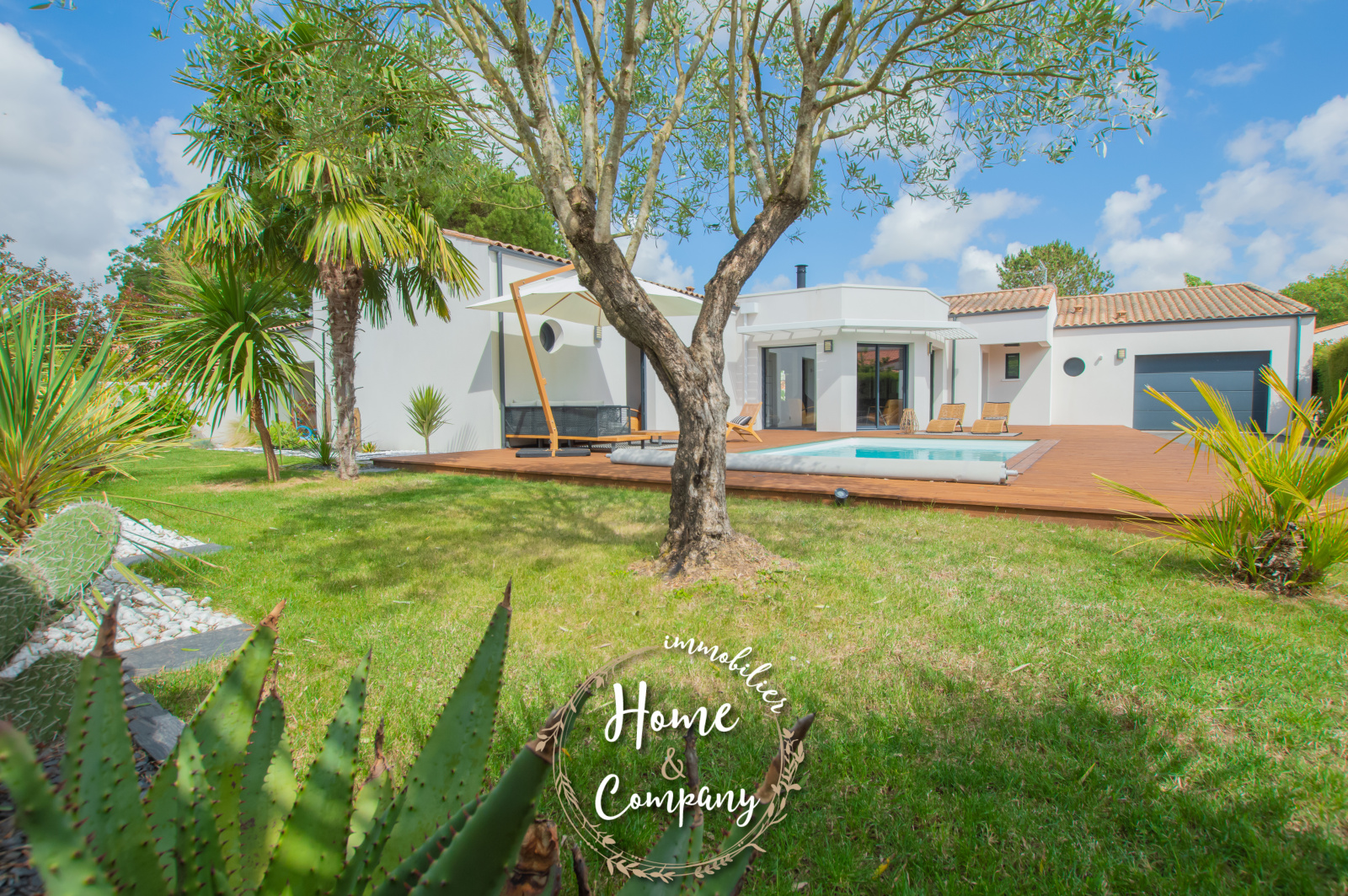 MEDIS - MAISON RECENTE DE PLAIN-PIED AVEC PISCINE - Située à 1200m des commerces du centre-ville de MEDIS, dans un environnement calme et habité à l'année, Home & Company Immobilier vous présente cette magnifique maison de 159 m2 habitables entièrement de plain-pied, en excellent état sur un terrain de 823 m2. Principalement orientée vers ses extérieurs avec de nombreux pôles, cette maison très lumineuse offre une belle pièce de vie de 72 m2 avec poêle à bois suspendu comprennant une cuisine ouverte aménagée et équipée. Le séjour ouvre au choix, soit sur une terrasse en bois avec piscine, soit sur 2 patios permettant de profiter du jardin à chaque moment de la journée. Côté nuit, elle se compose de 2 suites parentales (avec salle d'eau, WC, dressing) et de 2 autres chambres avec chacune une salle d'eau privative et WC. WC indépendant au niveau de l'entrée. Un garage de 40m2, un cellier et une buanderie constituent les annexes de cette maison où l'on retrouve une belle hauteur sous plafond et un très beau jardin paysagé. Stationnement aisé sur la parcelle. Prestations de qualité (chauffage au sol électrique, volets roulants motorisés, baie alu à galandage...). DONT honoraires 3,90% à la charge de l'acquéreur. Montant moyen estimé des dépenses annuelles d'énergie pour un usage standard, établi à partir des prix de l'énergie de l'année 2021 : entre 1420€ et 1970€.