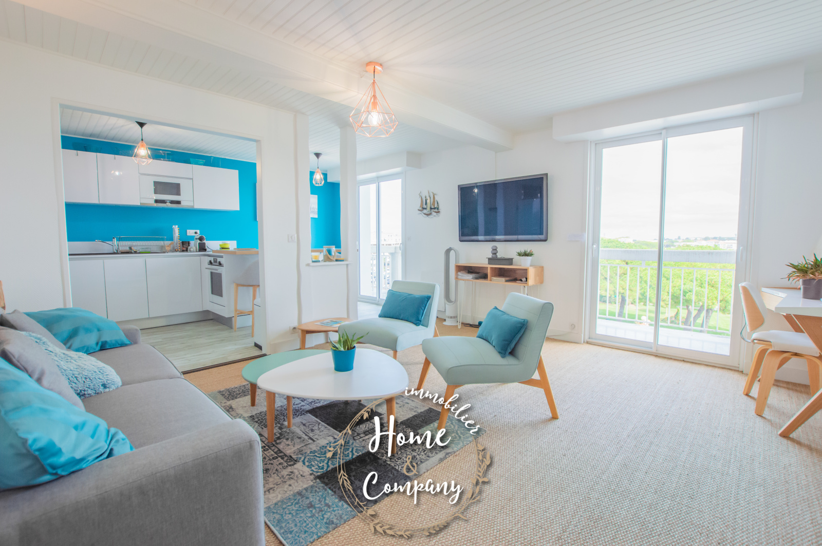 ROYAN QUARTIER DU PORT - APPARTEMENT VUE MER - Situé à 350m de la plage de Foncillon, dans le quartier du Port de ROYAN et à proximité immédiate des commerces du centre-ville, Home & Company Immobilier vous présente ce bel appartement de type duplex avec une VUE MER, développant 50m2 habitables. Au 3ème et dernier étage avec ascenseur, ce beau duplex joliment rénové, offre une entrée, un beau séjour lumineux exposé SE, une cuisine ouverte ouvrant sur un balcon et une salle d'eau avec WC. L'étage regroupe une chambre, une salle d'eau avec WC et un couchage d'appoint mansardé avec velux. L'architecture des années 50 se fait ressentir dans les lieux. Cet appartement fonctionnel séduit par son emplacement et sa magnifique vue surplombant la vie animée de ROYAN. DONT honoraires 3,89% à la charge de l'acquéreur. Plus de photos et visite virtuelle sur le site de l'agence Home & Company Immobilier. Montant moyen estimé des dépenses annuelles d'énergie pour un usage standard, établi à partir des prix de l'énergie de l'année 2015 : 408,91€.