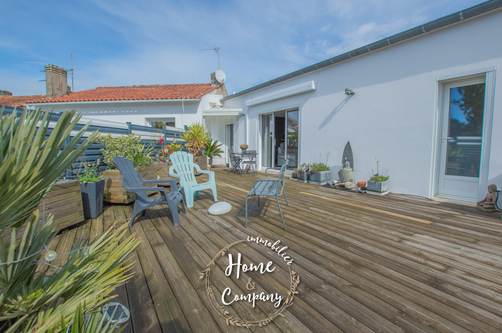 ROYAN CENTRE AU MARCHÉ CENTRAL - APPARTEMENT AVEC TERRASSE - Situé à quelques mètres du marché central de ROYAN, Home & Company Immobilier vous présente cet appartement en duplex rénové avec goût en 2018. Ayant la composition d'une maison de ville, cet appartement offre au rez-de-chaussée une entrée et la cage d'escalier amenant à l'espace de vie. Cet étage va dévoiler une pièce de vie traversante de 33m2 ouvrant sur une grande terrasse intime de 93m2 exposée Sud et Sud-Ouest. Cette pièce de vie propose un coin salon, repas et une cuisine ouverte aménagée et équipée. Un dégagement viendra desservir une première chambre avec placards, une salle de bains avec baignoire balnéo, un WC indépendant puis une suite parentale avec dressing, placard et salle d'eau/WC. En opposition une 3ème chambre amènera à un cellier/buanderie. Loggia. En sous-sol, une cave assurera la fonction de stockage. Un garage à environ 300m pourra finir le tout en supplément. De bonnes prestations sont assurées : clim réversible, domotique pour les volets, adoucisseur, double et triple vitrage, ... Visite virtuelle sur le site de l'agence Home & Company immobilier. DONT honoraires 3,89% à la charge de l'acquéreur. Montant moyen estimé des dépenses annuelles d'énergie pour un usage standard, établi à partir des prix de l'énergie de l'année 2021 : entre 1100€ et 1550€.