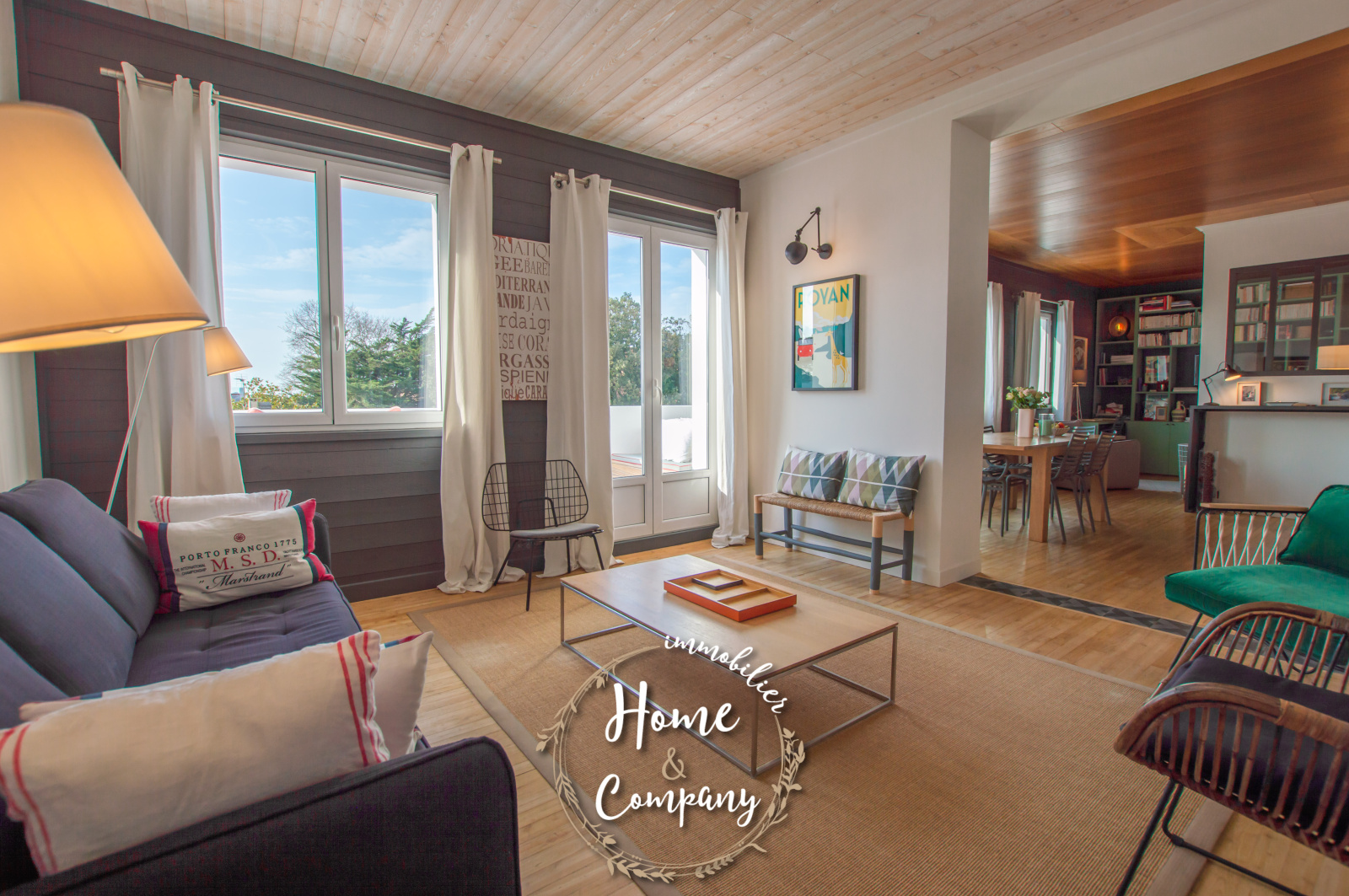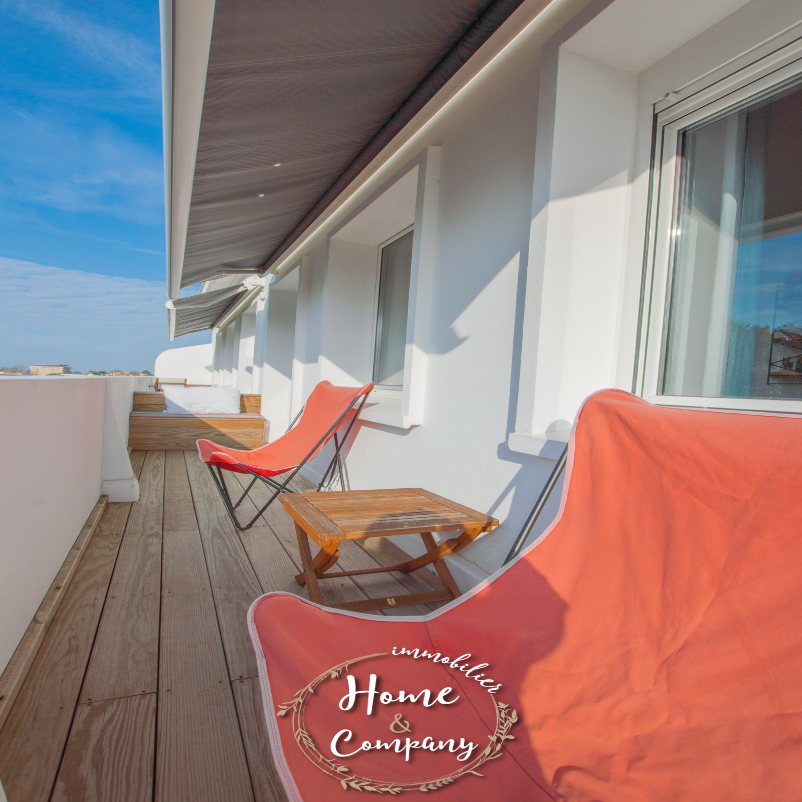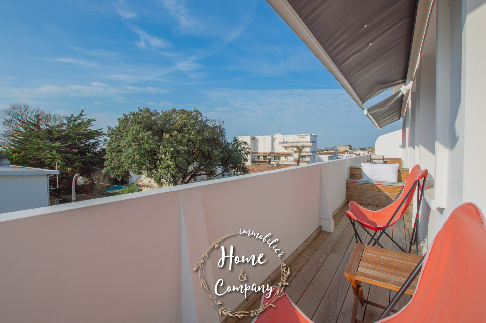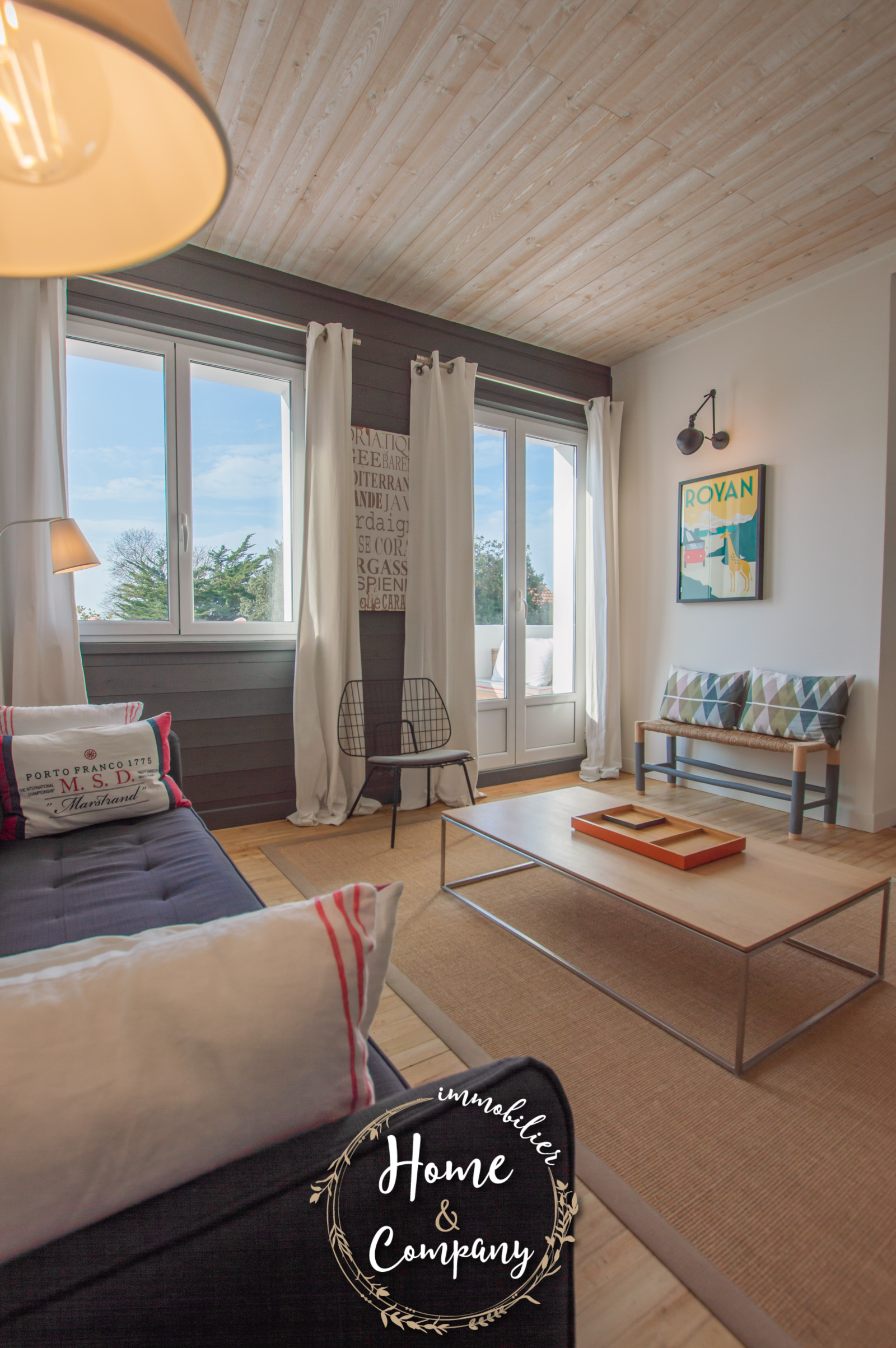 ROYAN LE CHAY - APPARTEMENT AU DERNIER ETAGE - Situé dans un secteur très convoité à 450m de la plage du Chay avec des aperçus mer et à 800m des commerces du centre-ville de ROYAN, Home & Company Immobilier vous présente ce magnifique appartement rénové de 101m2 habitables au 3ème et dernier étage d'une petite résidence sécurisée sans ascenseur. Remanié et rénové avec goût, il est présenté dans un excellent état où règne une atmosphère plus que plaisante. Cet appartement dispose d'un espace séjour de 42m2 dont une partie est utilisée en un coin petit salon plus intime le tout ouvrant sur une terrasse filante offrant une vue dégagée et des aperçus mer, une cuisine indépendante de type laboratoire aménagée et équipée, un dégagement avec placard desservant une première partie nuit réservée à l'espace propriétaire avec une chambre, une SDE et un WC indépendant. En opposition, la deuxième partie nuit est composée de 2 chambres dont une avec aperçu mer, une SDB, un WC indépendant et une buanderie. Une cour commune, 1 cave et 1 garage constituent les annexes de ce bien rare sur le secteur. DONT honoraires 3,88% à la charge de l'acquéreur. Plus de photos et visite virtuelle sur le site de l'agence Home & Company Immobilier.