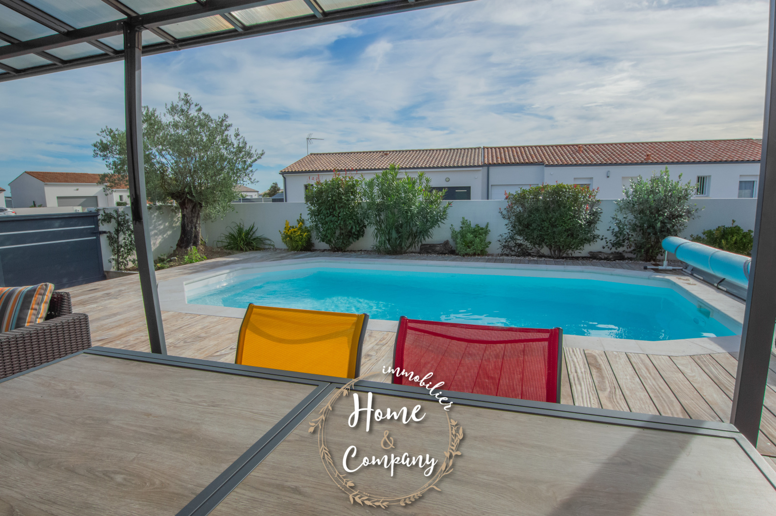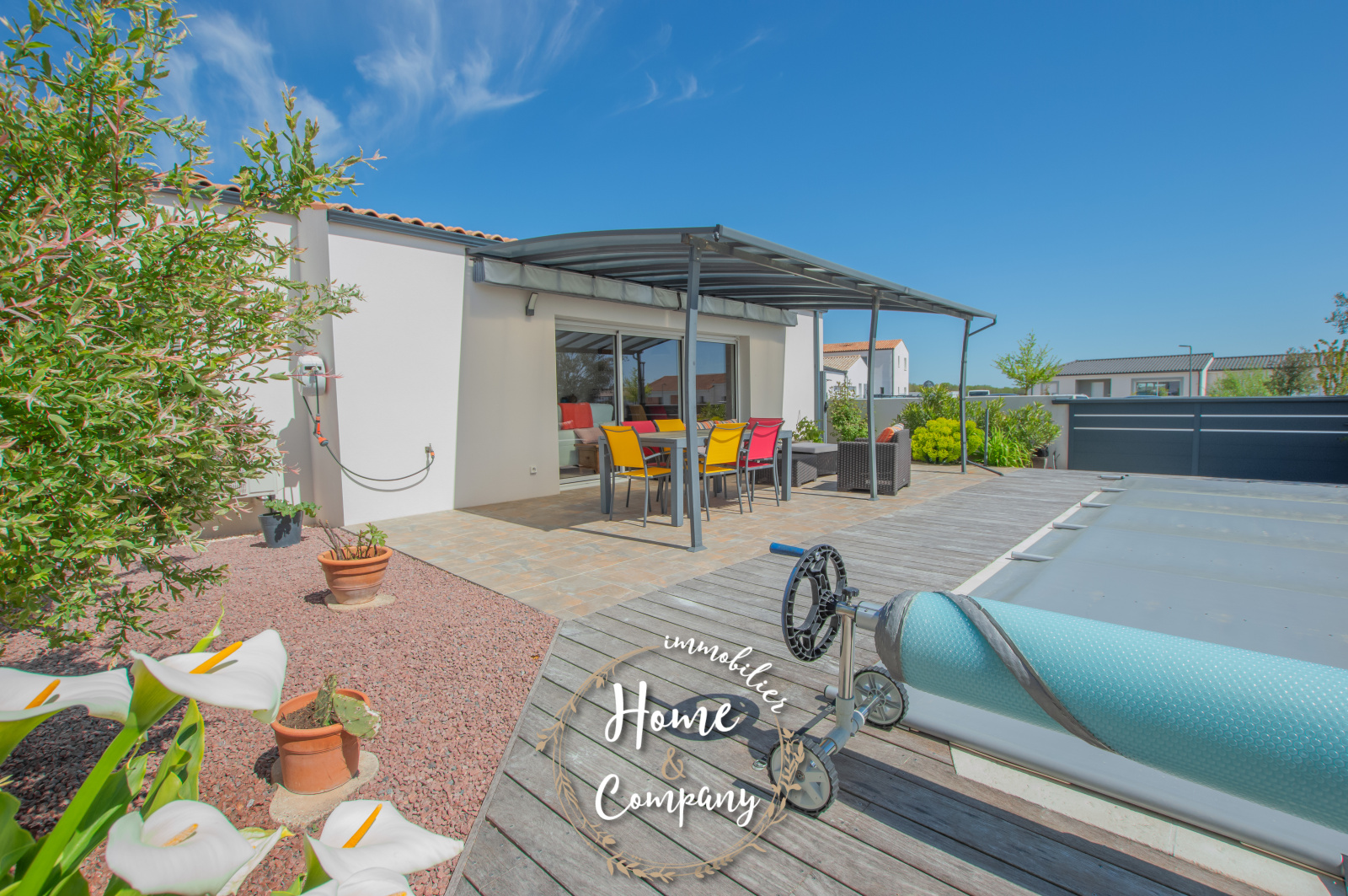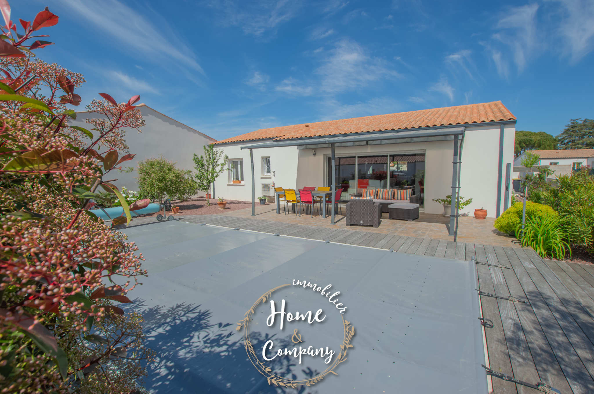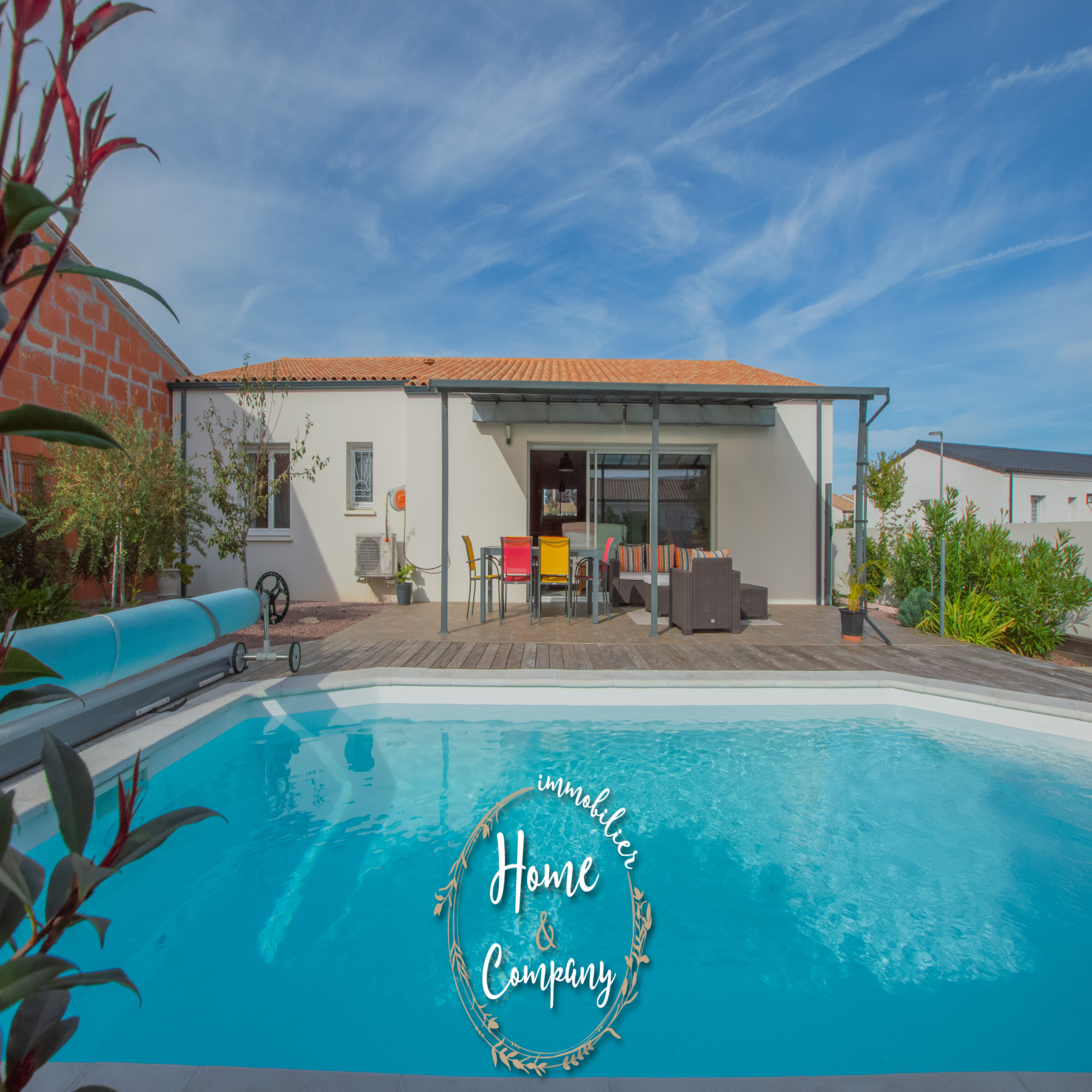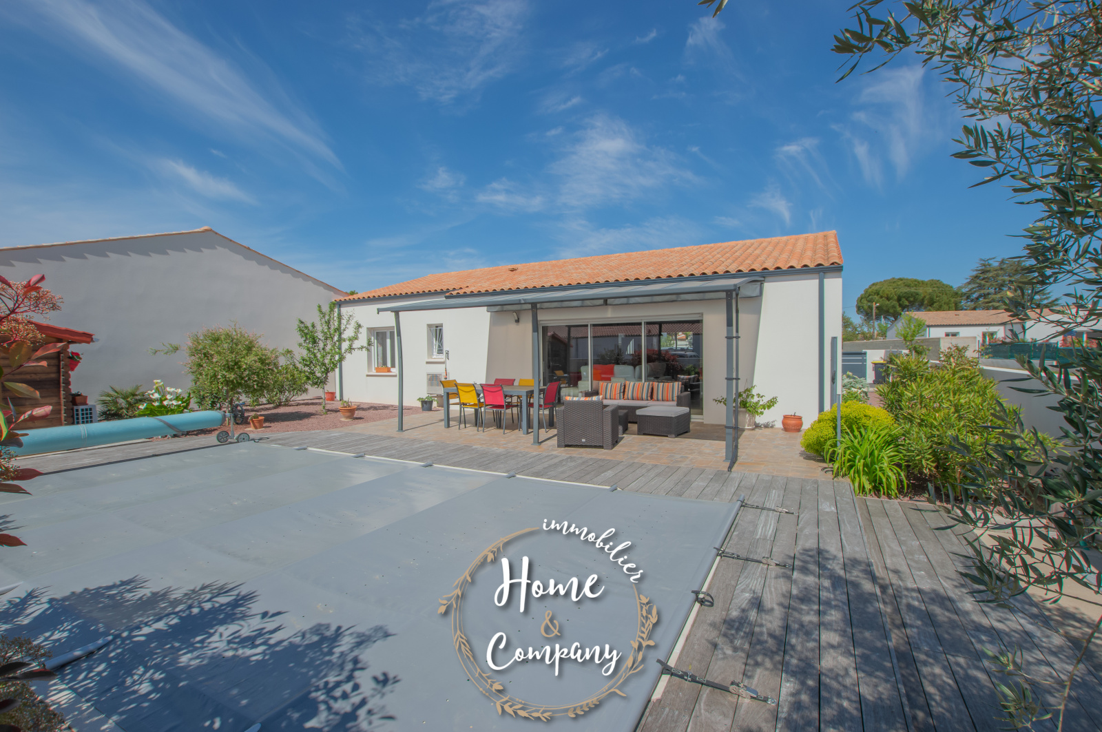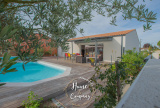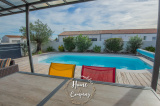 SAINT-SULPICE-DE-ROYAN - MAISON RÉCENTE DE PLAIN-PIED - Située à quelques mètres des commerces du centre, Home & Company Immobilier vous présente cette maison de 2021 de plain-pied offrant 97m2 habitables sur une parcelle de 418m2. Elle offre une entrée, une belle pièce de vie de 54m2 intégrant une cuisine ouverte aménagée et équipée. Le séjour ouvre par une grande baie vitrée sur une terrasse exposée SO vue sur la piscine chauffée. Un dégagement avec placard vient desservir l'espace nuit composé de 3 chambres avec placards, d'une salle d'eau et d'un WC indépendant. Un garage et un abri de jardin constituent les annexes de cette maison agréable, aboutie et très bien entretenue. Stationnement sur la parcelle. DONT honoraires 3,54% à la charge de l'acquéreur. Montant moyen estimé des dépenses annuelles d'énergie pour un usage standard, établi à partir des prix de l'énergie de l'année 2021, 2022 et 2023 : entre 510€ et 730€.