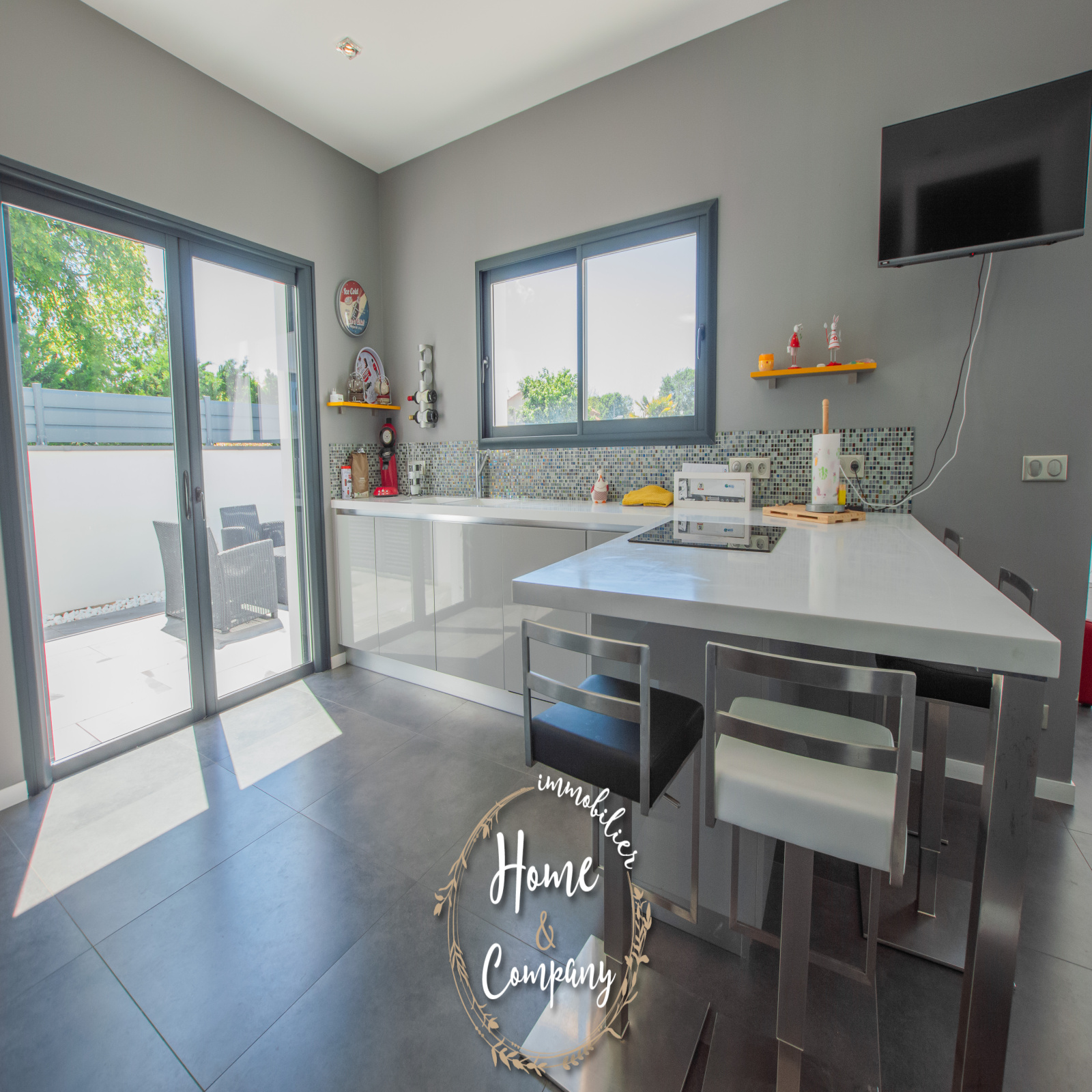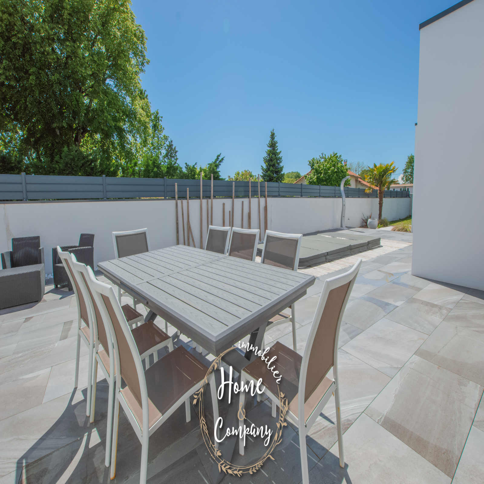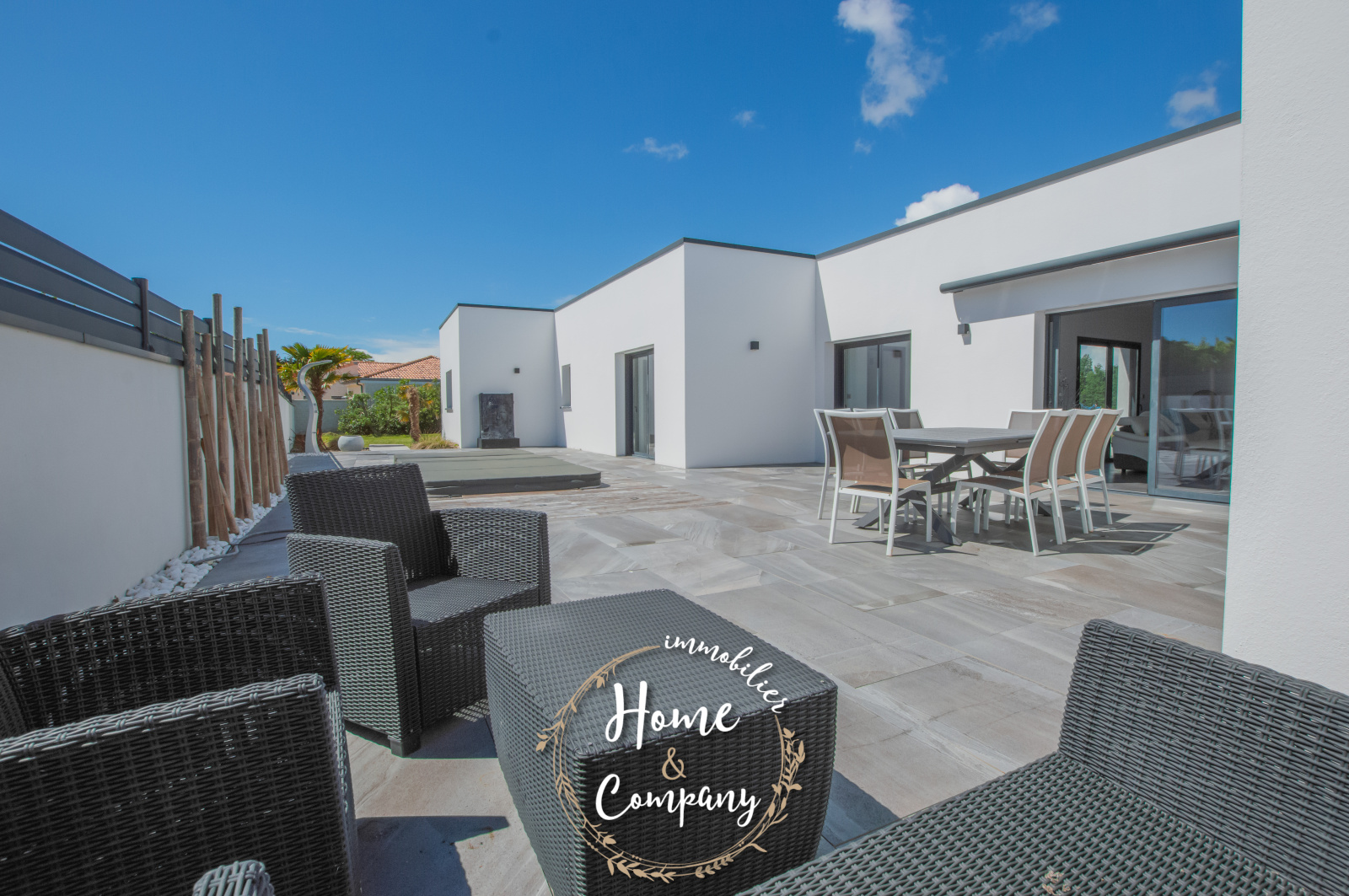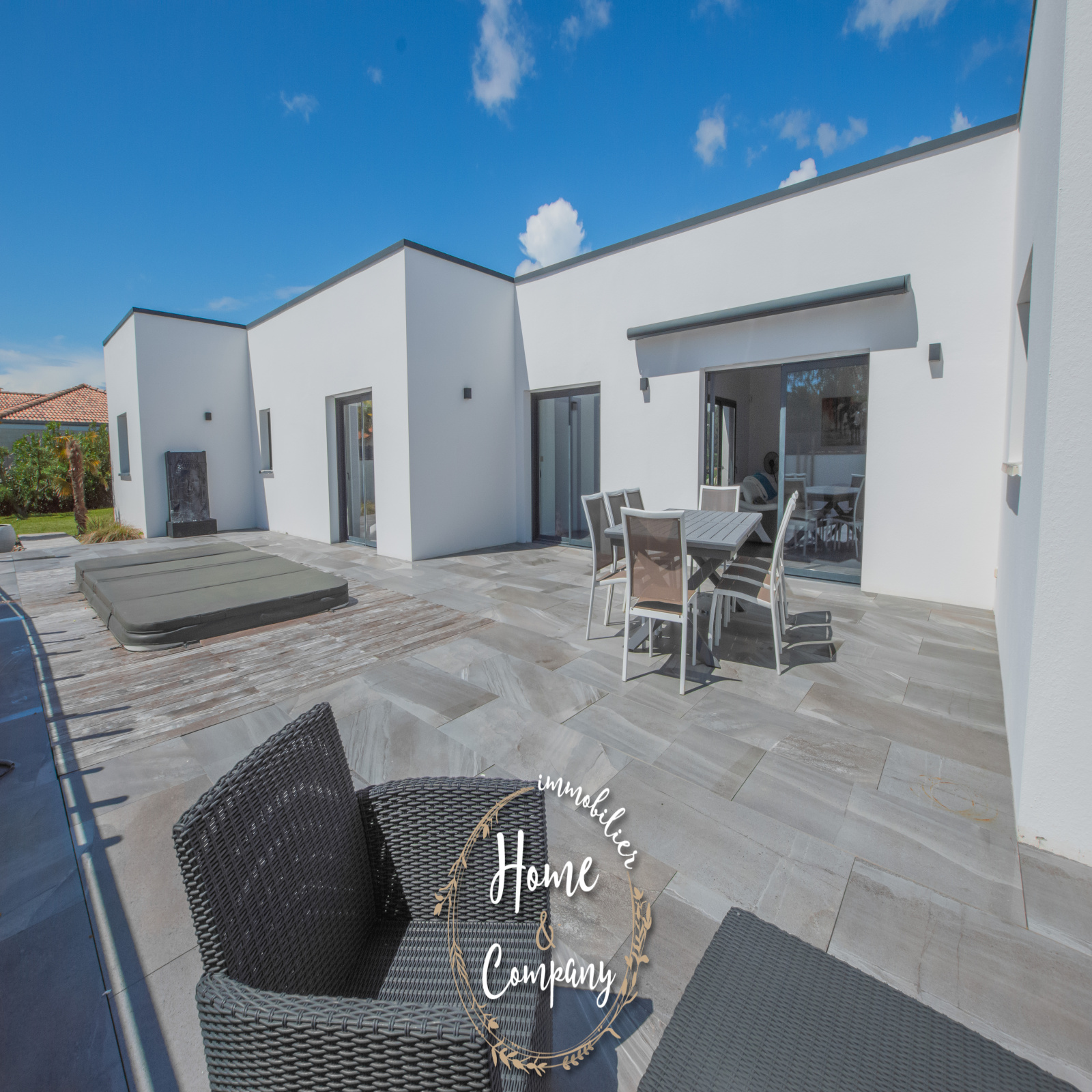 SAINT-PALAIS-SUR-MER - MAISON RÉCENTE CUBIQUE AVEC SPA DE NAGE - Située à moins de 1800m des commerces et à moins de 2900m de la plage de Nauzan, Home & Company Immobilier vous présente cette agréable maison récente de plain-pied offrant une superficie habitable de 158m2 sur une parcelle de 803m2. Judicieusement pensée et tournée vers ses différents pôles extérieurs, elle saura vous offrir un véritable confort de vie. Dès l'entrée passée, cette maison dévoile une belle pièce de vie de 62m2, baignée de lumière grâce à ses nombreuses ouvertures donnant sur différentes terrasses. La cuisine ouverte, de bonne facture, faisant partie intégrante de cette pièce de vie est aménagée et équipée. Un dégagement viendra desservir 3 chambres dont une avec dressing, l'ensemble se partageant une salle de bains avec douche italienne et un WC indépendant. En opposition une 4ème chambre avec salle d'eau complète la capacité d'accueil. 2ème WC indépendant. Deux terrasses aux expositions différentes agrémentent le jardin ainsi qu'un spa de nage. Un cellier et un garage de 25m2 constituent les annexes. De bonnes prestations sont assurées : accès motorisés, domotique, interphone/visiophone, chauffage au sol par PAC, VMC double-flux... Du stationnement privatif est assuré pour cette maison aboutie. Plus de photos et visite virtuelle sur le site de l'agence Home & Company immobilier. DONT honoraires 3,90% à la charge de l'acquéreur. Montant moyen estimé des dépenses annuelles d'énergie pour un usage standard, établi à partir des prix de l'énergie de l'année 2021 : entre 620€ et 900€.
