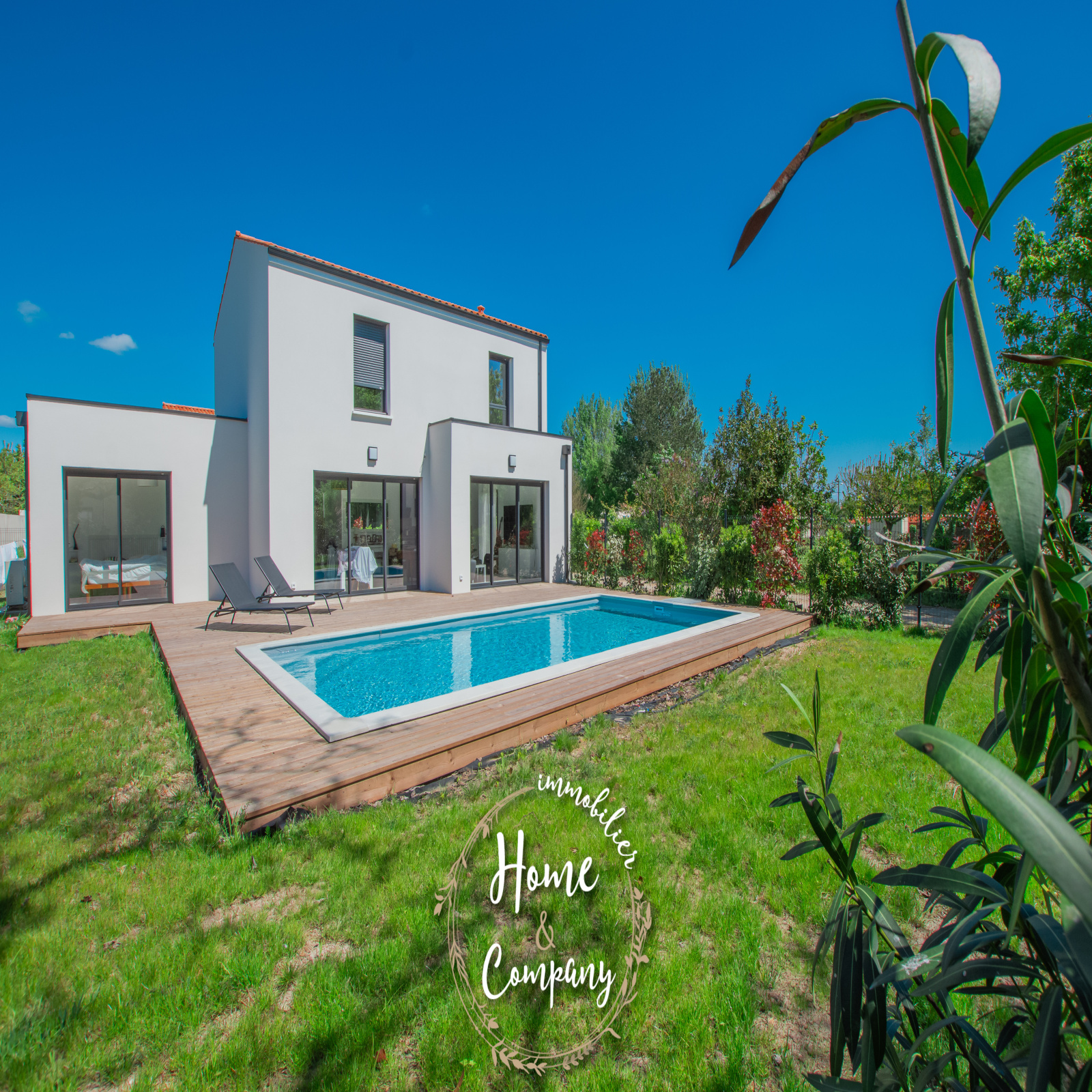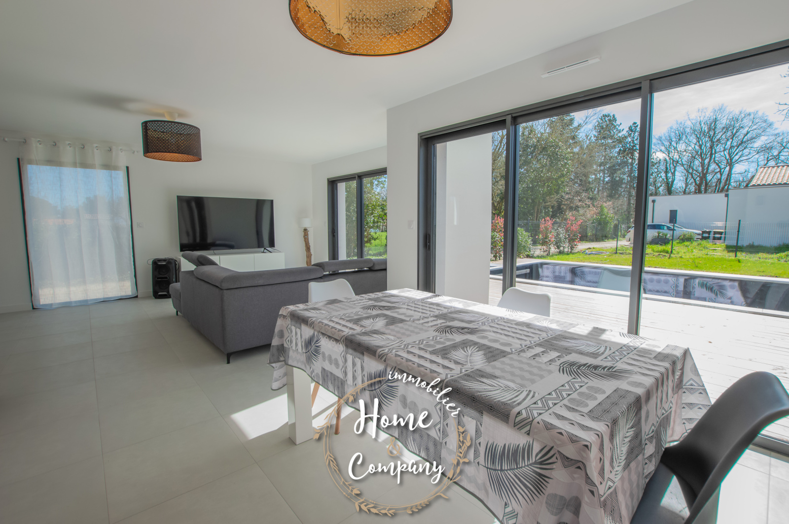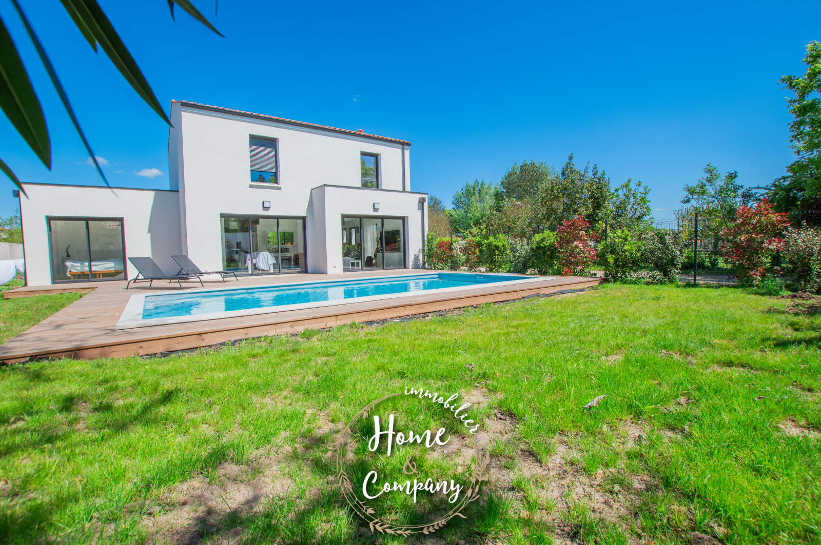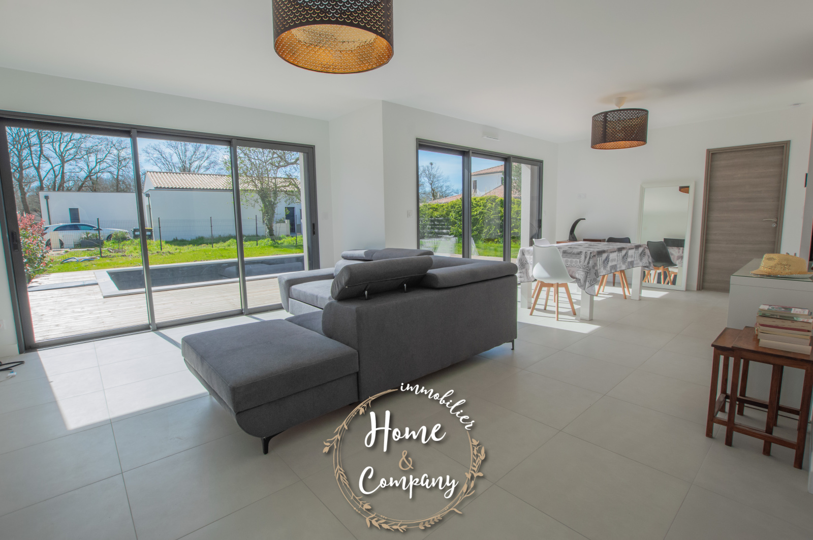 BREUILLET - MAISON NEUVE AVEC PISCINE - Située dans un quartier calme et habité à l'année, à 250m des commerces du centre-ville de BREUILLET, Home & Company Immobilier vous présente cette jolie maison neuve sur 2 niveaux, offrant une superficie habitable de 124m2 sur une parcelle de 600m2 avec du stationnement privatif. En rez-de-chaussée, elle comprend une entrée, un beau séjour lumineux de 46 m2 avec une cuisine ouverte aménagée et semi-équipée. Côté nuit, une suite parentale avec sa salle d'eau privative et WC. Deuxième WC séparé. L'étage regroupe 3 chambres, une salle d'eau et un WC. Piscine de 8x4m. Un garage de 25m2 et un cellier constituant les annexes de cette jolie maison moderne avec garanties (décennale et dommages ouvrage) où l'on retrouve le confort et les performances énergétiques d'aujourd'hui : chauffage au sol, domotique, bonne isolation... Visite virtuelle sur le site de l'agence Home & Company immobilier. DONT honoraires 3,13% à la charge de l'acquéreur. FRAIS DE NOTAIRES REDUITS. Montant moyen des dépenses annuelles d'énergie pour un usage standard, établi à partir des prix de l'énergie de l'année 2021 : entre 410€ et 610€.